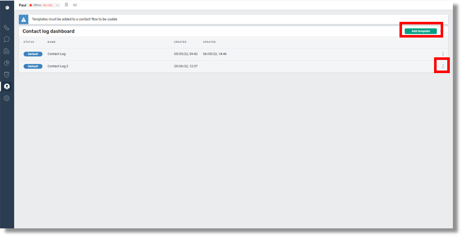 From this screen you can edit or delete any contact log configuration by selecting the three dots next to the specified configuration and also create a new template by selecting the Add template button.