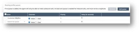 Next assign some queues to the routing profile. A blank row will already be visible. Once you’ve added the first queue, click the Add queue button to add more