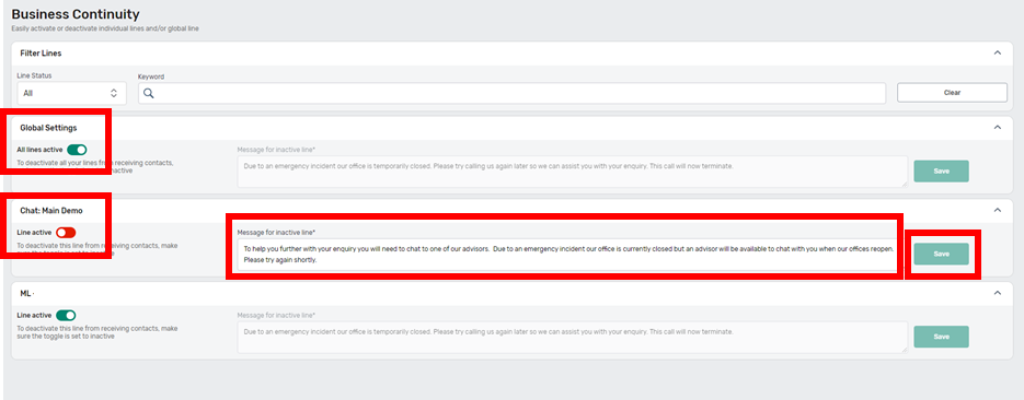 If the toggle switch is green, then lines / channels are active. If however, you get an unexpected situation, you can switch them off by selecting the toggle switch, turning it to red. You can then input a specific text message that will be played to customers while the lines are switched off and select the “Save” button.