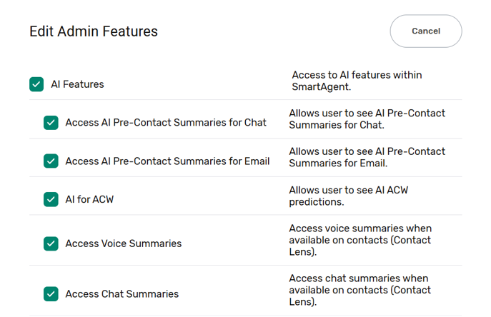 We’ve updated how our AI permissions are managed. Permissions for AI features are now grouped together, and those using Contact Lens have been rationalised to ensure consistency between SmartAgent and Amazon Connect.