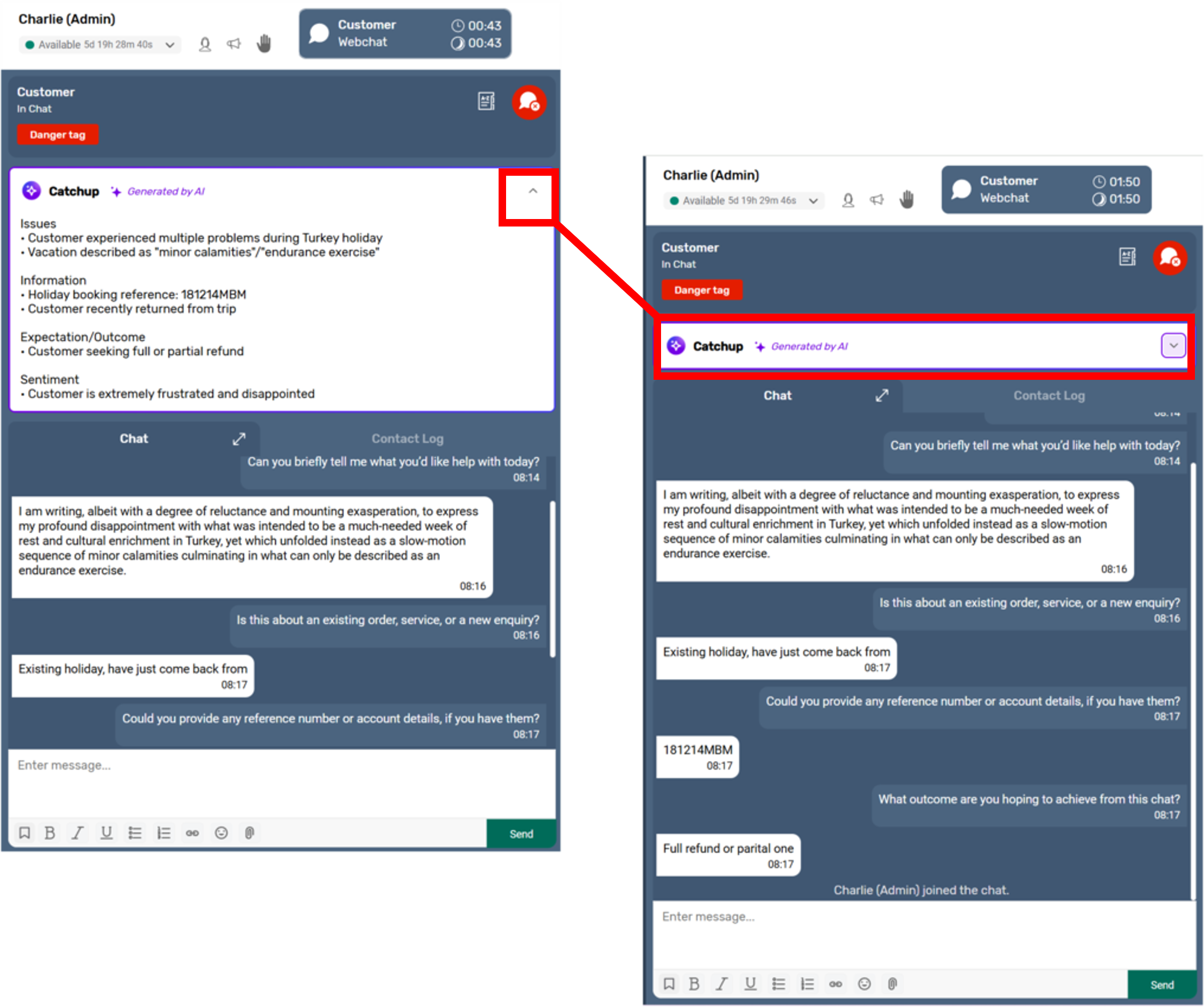 - Automatic Summaries- AI analyses the customer chat history and generates a summary, highlighting key details agents need to know.